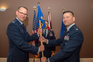 U.S. Air Force Col. Eric Oliver, 422th Air Base Group Commander, hands the guide-on to Lt. Col. Olexis Perez, 422nd Communications Squadron Commander, at RAF Fairford, June 14, 2018. The Change of Command Ceremony is done in front of the squadron to show the formal transfer of authority.