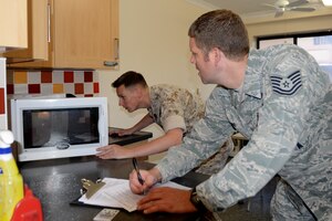 A thin sliver of light shone through the break between two heavy, dark curtains. No one saw, no one noticed the slight, almost imperceptible, movement of fabric. Everyone's attention was focused at the base of the stage where Col. Douglas Mellars, 422nd Air Base Group commander, was briefing Airmen