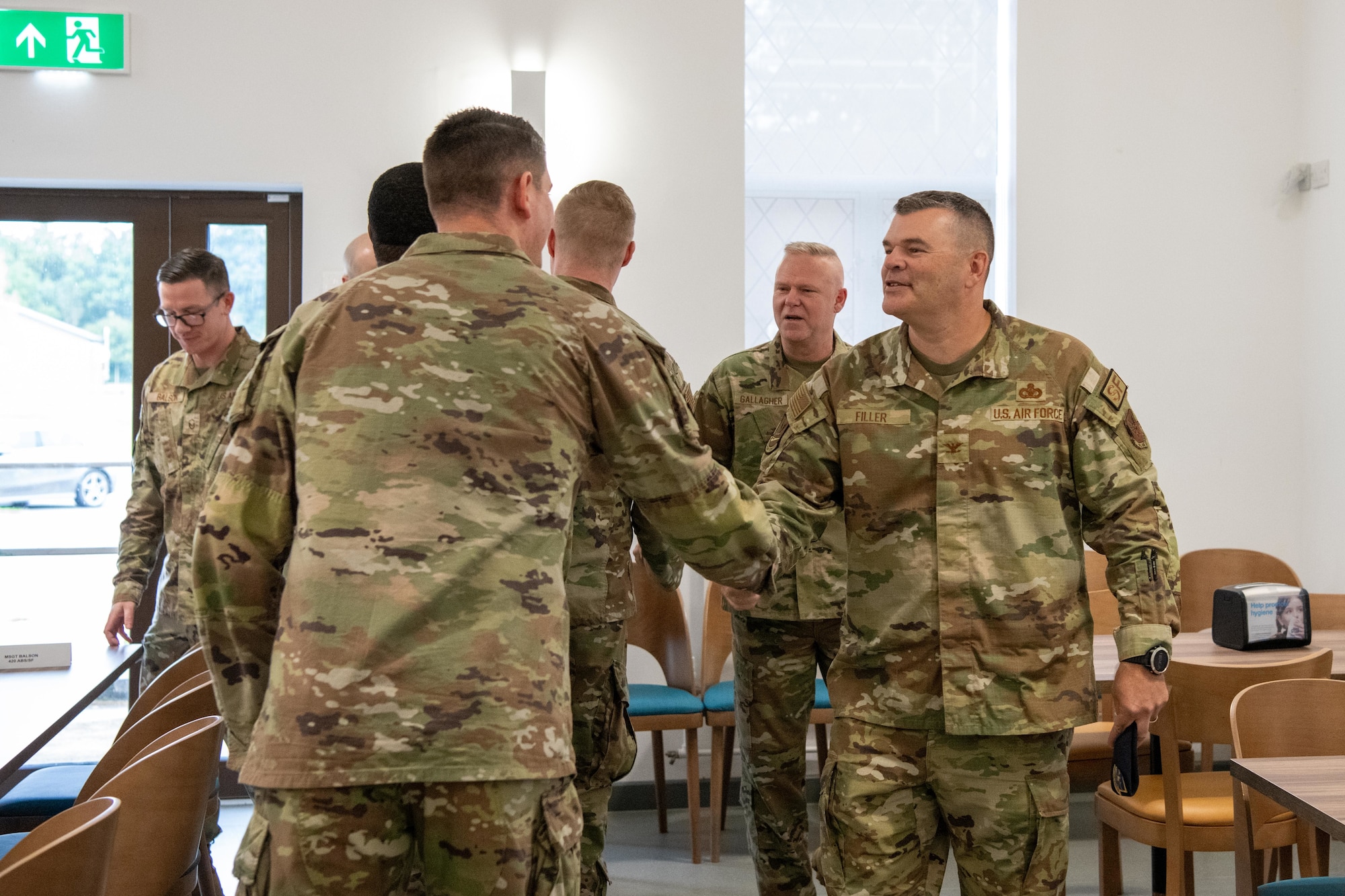 RAF FAIRFORD, England -- U.S. Air Force Col. Brian A. Filler, director of Security Forces, deputy chief of staff for Logistics, Engineering and Force Protection, and his team recently visited RAF Fairford and RAF Croughton, England, Oct. 2, 2024. The visit included security operations discussions and recognizing some exceptional Defenders during Filler's first troop luncheon and all call as the director of Security Forces.